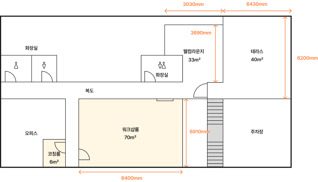 # 단독 공간 76㎡ + 공용 공간 61㎡