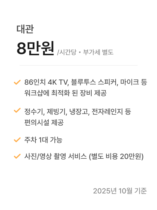 워크샵룸 장비 : LG 86인치 LED 4K TV(HDMI 및 블루투스 연결 가능)